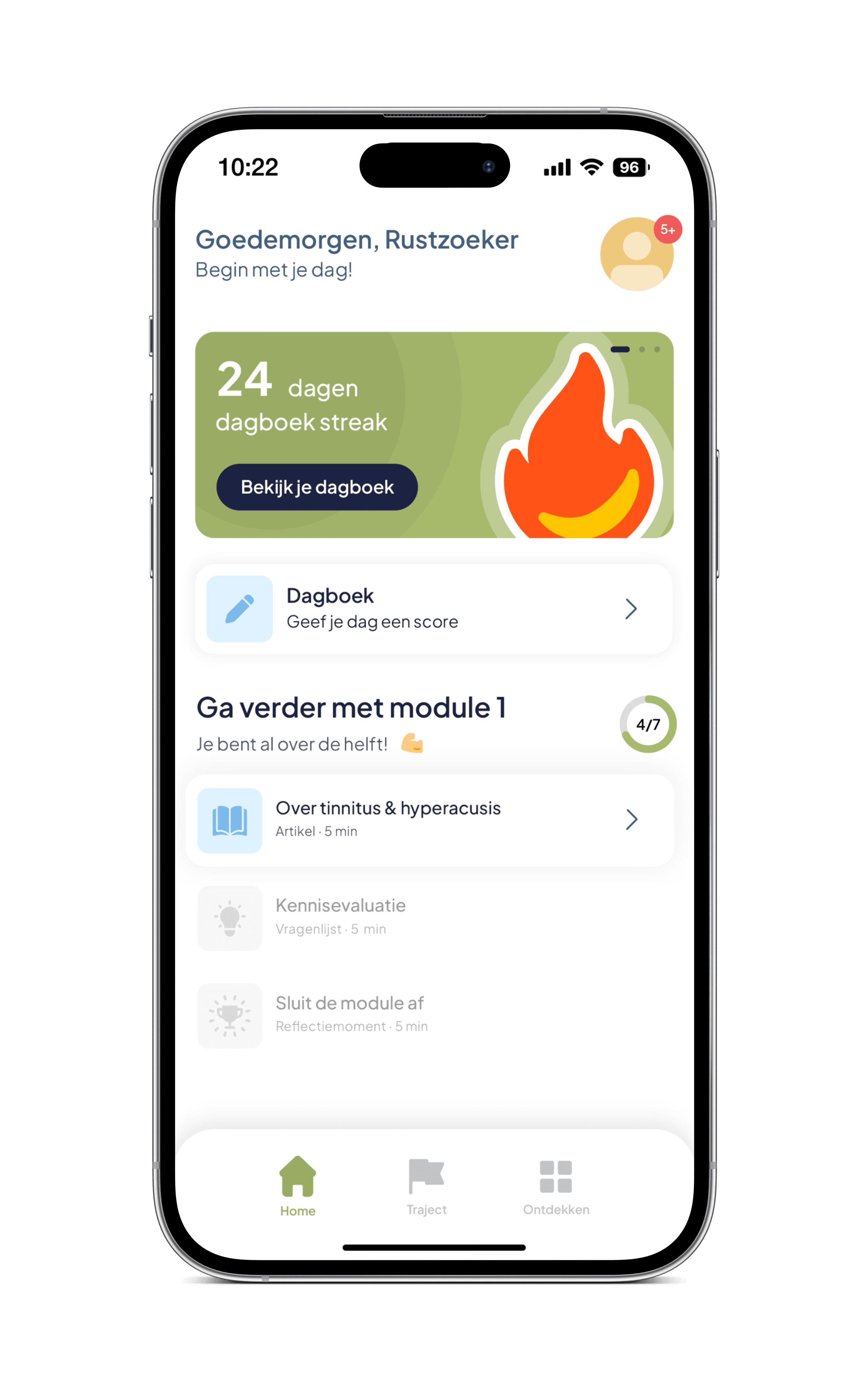 Tinzo is er voor iedereen die leeft met tinnitus of hyperacusis. Of je nu net begint met klachten of er al jaren mee rondloopt, de app biedt praktische ondersteuning in het dagelijks leven. Tinzo helpt je omgaan met het constante geluid, overgevoeligheid voor geluiden en de mentale belasting die daarbij komt kijken. Je hoeft het niet alleen te doen.
